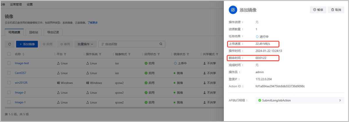 ZStack Cloud 5.0.0开始,用户通过本地文件上传镜像时,可在任务详情中查看当前镜像上传速率和预计剩余时间,更好把握镜像上传实时动态。