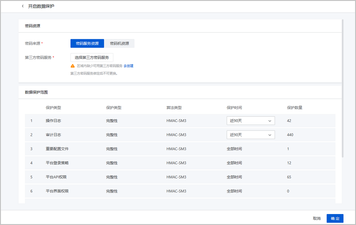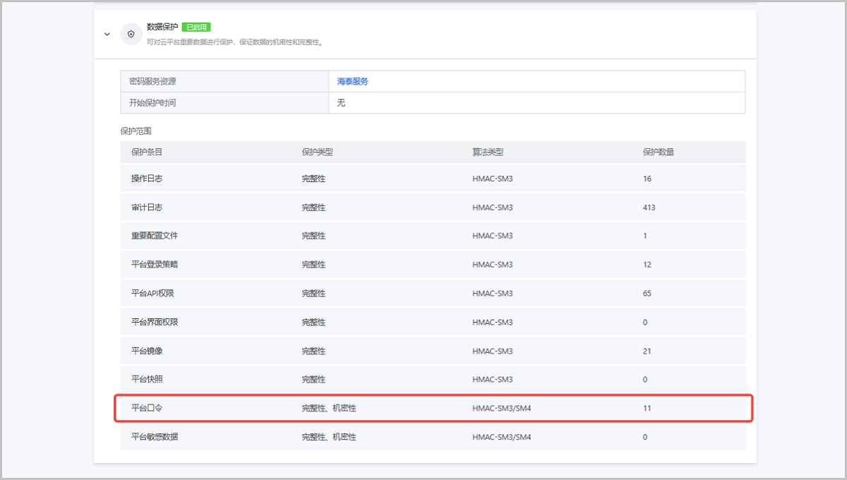 用户开启数据保护即可触发平台口令完整性保护。开启后,如检测到本地用户登录口令被非法篡改,该用户将被禁止登录云平台;如检测到其他资源口令被非法篡改,资源列表和资源详情页均将展示醒目提示,提醒用户及时检查口令安全。