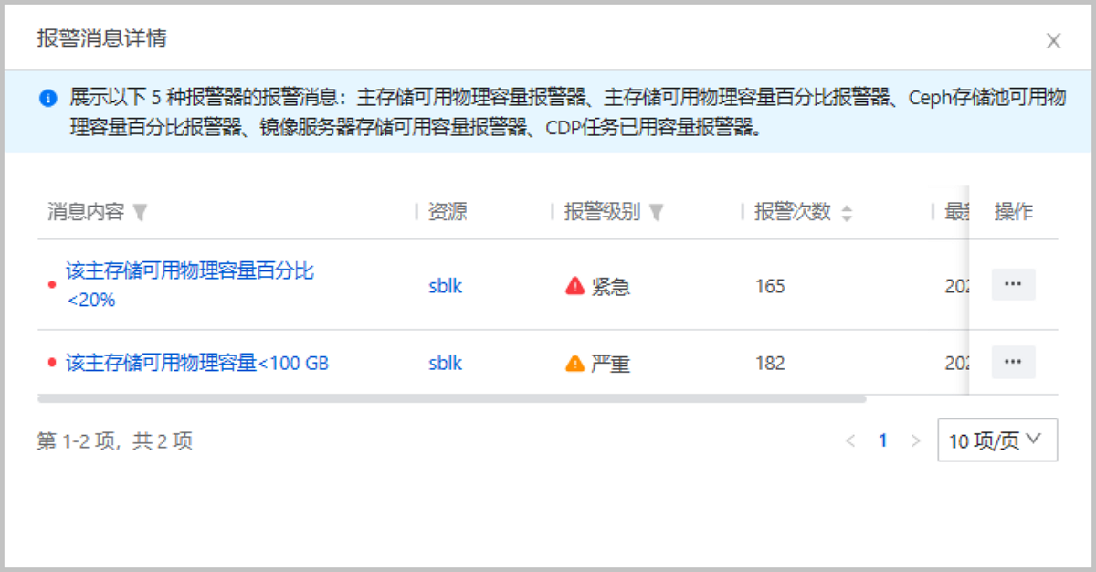 此外,ZStack Cloud 4.7.21增强了主存储相关报警提示,包括该主存储可用物理容量、该主存储可用物理容量百分比、以及Ceph存储池可用物理容量百分比。通过重要资源故障风险提示提供更加显眼和准确的资源报警信息,以便运维人员及时发现并处理存储资源超负荷的情况。