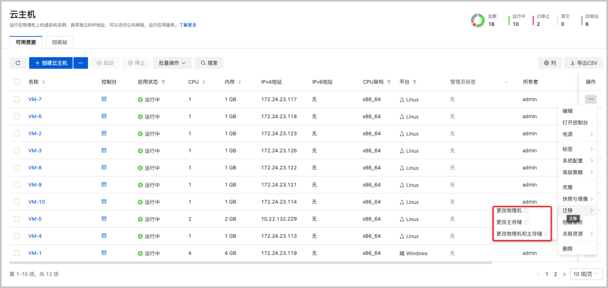 在之前版本中,ZStack Cloud支持两种云主机迁移场景:云主机迁移、存储迁移。执行云主机迁移操作,将仅更改云主机所在物理机,不更改主存储。执行存储迁移操作,将同时更改云主机所在的物理机和主存储。
