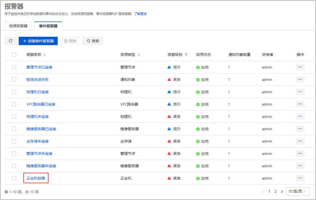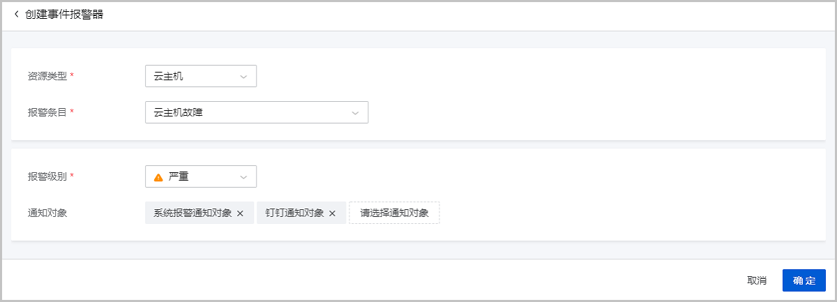 图 1. 新增云主机故障默认报警器
