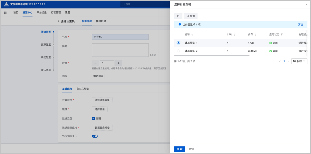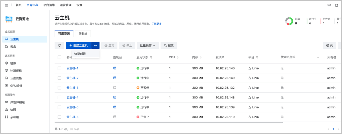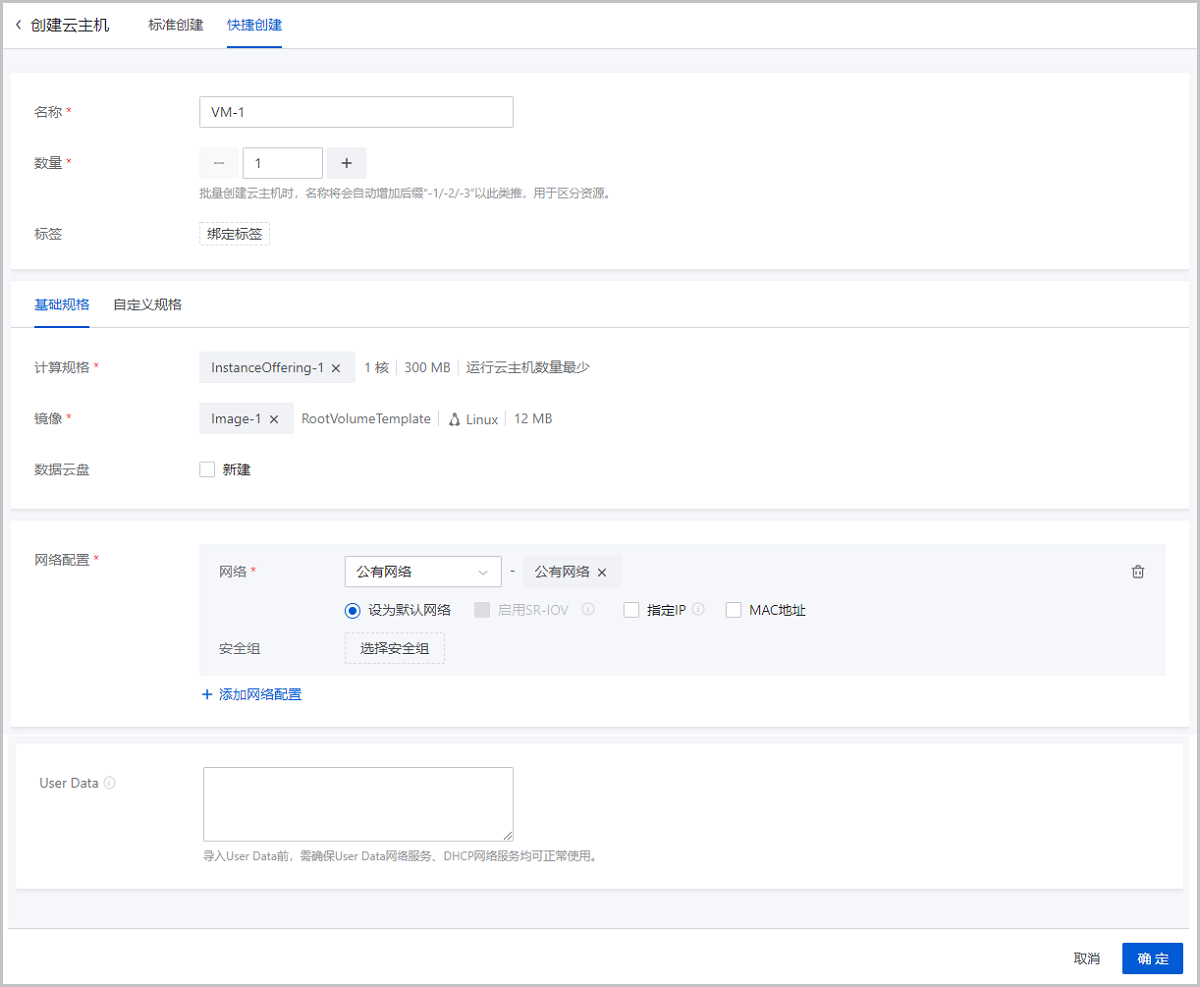 ZStack Cloud 4.0.0 支持快捷创建云主机,用户只需填写几条核心信息,即可一步创建云主机,大幅提升操作效率。UI界面提供两个快捷创建云主机入口:云主机列表页、云主机创建页,如图 2图 3所示: