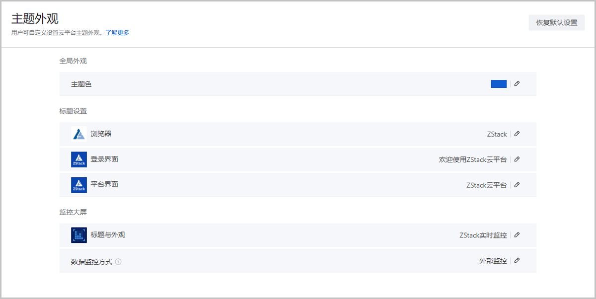 ZStack Cloud 4.0.0 对自定义主题外观进行功能增强,在原有自定义标题和图标的基础上,新增支持一键定制云平台主题外观。目前有8种企业级主题色彩供用户挑选,全面覆盖云平台所有账号视角(admin/账户/企业管理账号体系)的UI主题外观,如图 3所示: