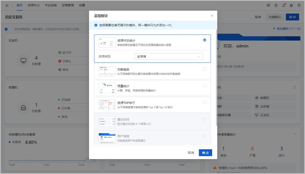 ZStack Cloud 4.0.0 开始,用户可按需自定义首页。云平台提供高达50种大/中/小固定尺寸的卡片模块供用户挑选。用户可基于实际生产需要,选择合适的卡片模块以拖拽方式直观快速进行首页布局,如图 1所示: