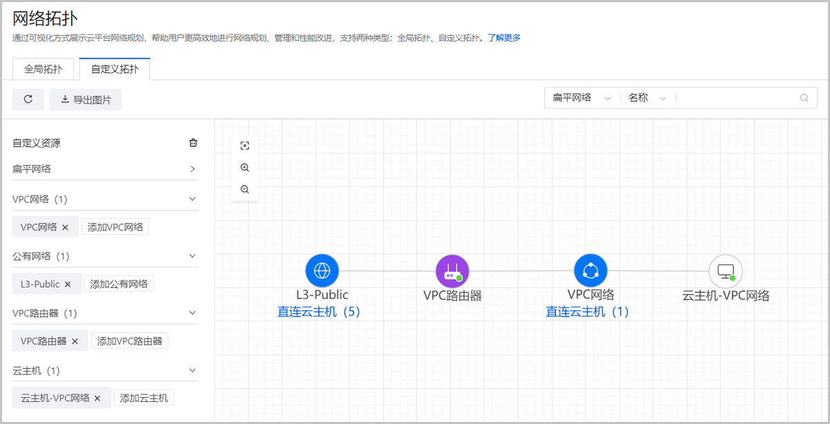 ZStack Cloud 4.0.0 对网络拓扑进行展示优化,在原有基础上升级排版布局,支持一键隐藏/显示云主机操作,提供更直观、更清晰的网络拓扑图,帮助用户更高效地进行云平台网络规划、管理和性能改进,如图 6图 7所示: