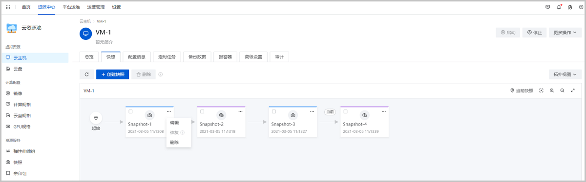 ZStack Cloud 4.0.0 为云主机/云盘资源提供两种快照展示方式:拓扑视图和列表视图,支持切换查看。其中,快照拓扑将资源的快照链和相关快照节点信息统一直观展示在一张画布上,用户可按需调整画布尺寸,便捷查看快照信息,且支持定位到当前快照,提高操作效率,如图 8所示:
