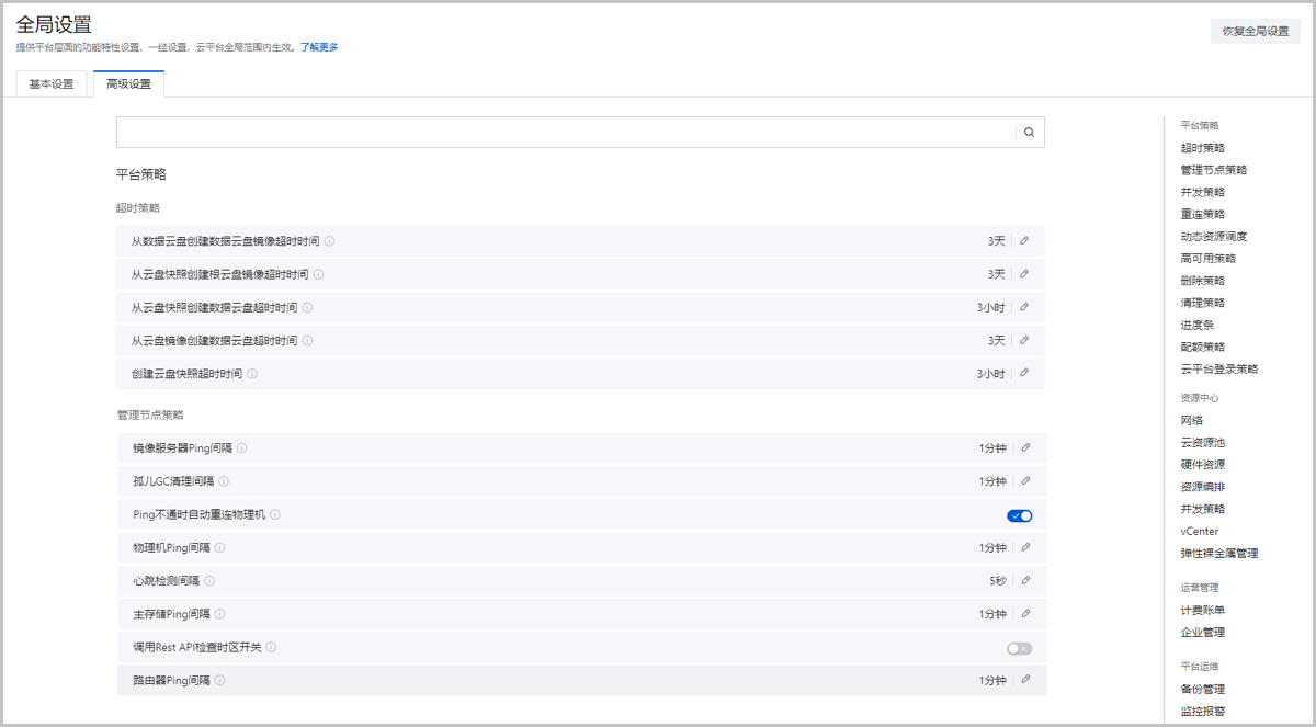 ZStack Cloud 4.0.0 将数百条全局设置基于用户业务场景进行精细化分类,用户可按目录查找相关配置条目,也可通过搜索框快速定位所需条目,如图 9所示: