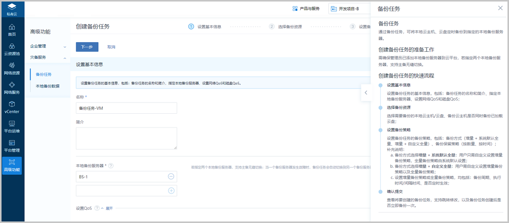 ZStack 3.10.0对企业管理中的项目成员(项目负责人/项目管理员/普通项目成员)开放灾备服务使用权限。云平台同时拥有企业管理和灾备服务模块许可证时,项目成员支持自主为所属项目的云主机/云盘资源创建备份任务,方便故障快速恢复,保障用户数据安全,如图 1所示: