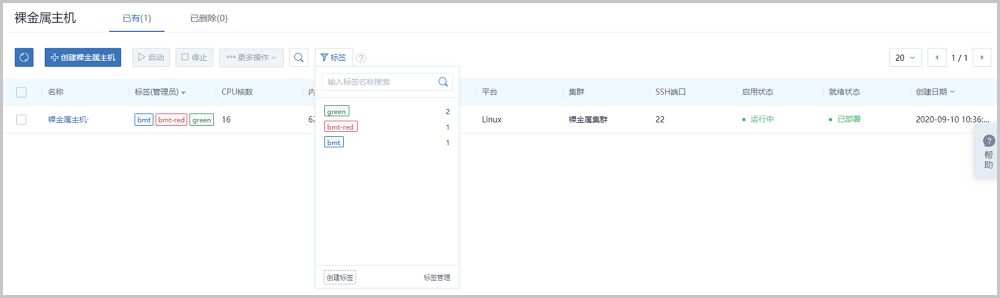 ZStack支持定制化标签功能,可通过标签类型及标签名称快速检索所需资源。之前版本已支持对云主机/云盘/物理机资源定制化创建标签,从ZStack 3.10.0开始,新增支持对裸金属主机资源定制化创建标签(仅支持管理员标签),并通过标签快速检索裸金属主机,如图 1所示: