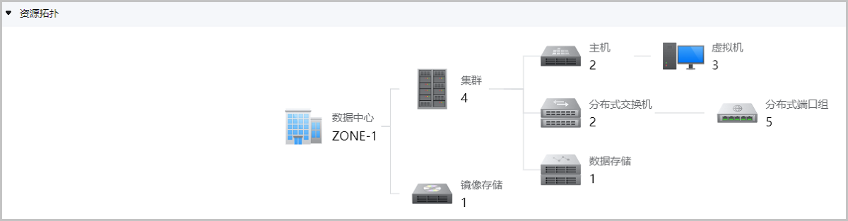 ZStack Cube 虚拟化版提供数据中心资源拓扑图,方便您快速掌握一个数据中心里所有资源的汇总信息。您可在目标数据中心总览页面查看该信息。
