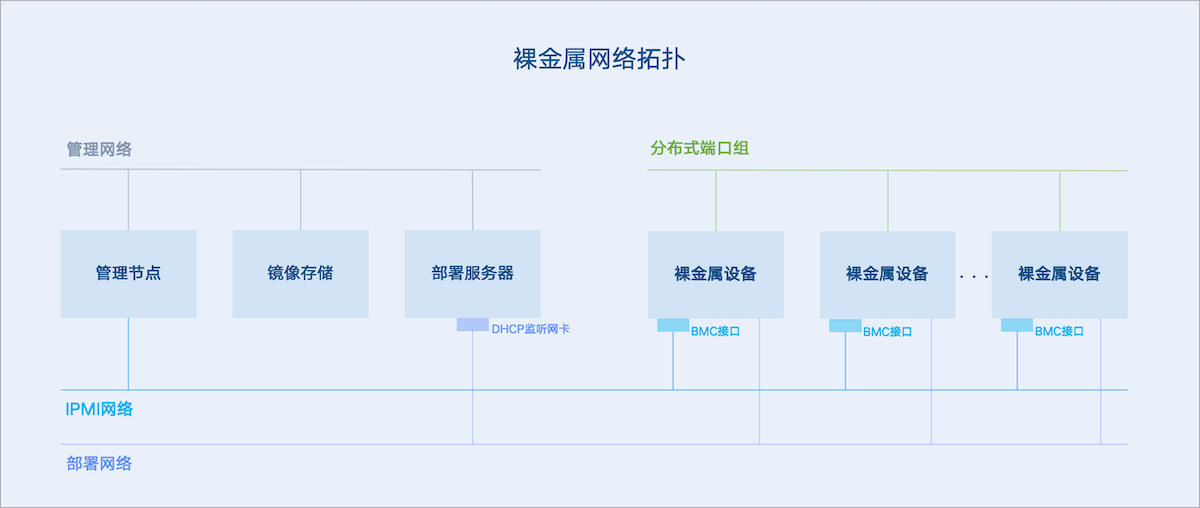 • 为实现裸金属设备的带外控制,要求裸金属设备配备 BMC 接口,并提前为每台裸金属设备配置好 IPMI 地址、端口、用户名和密码,以及提前规划 IPMI 网络,确保管理节点与裸金属设备的 BMC 接口通过 IPMI 网络连通。