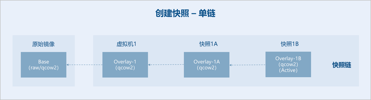 • 快照1B:新建空白文件Overlay-1B,backing file指向Overlay-1A,Overlay-1A置为只读,于是Overlay-1A成为一个快照,后续只对Overlay-1B写入数据。虚拟机1使用的是快照链内最后一个快照1B对应的磁盘文件,快照1B为Active。