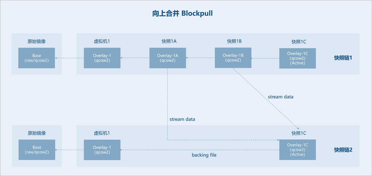 外部快照之间互相依赖(每一个overlay依赖它的backing file),每个快照保存有相应数据,不可直接删除某个快照来缩短链长度。外部快照可通过向下合并(Blockcommit)或向上合并(Blockpull)两种方式来缩短链长度。